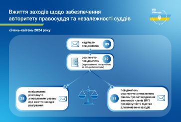 89 повідомлень про втручання у професійну діяльність суддів щодо здійснення правосуддя, про дії, що порушують гарантії незалежності суддів або підривають авторитет правосуддя надійшло до Вищої ради правосуддя упродовж січня – квітня 2024 року.