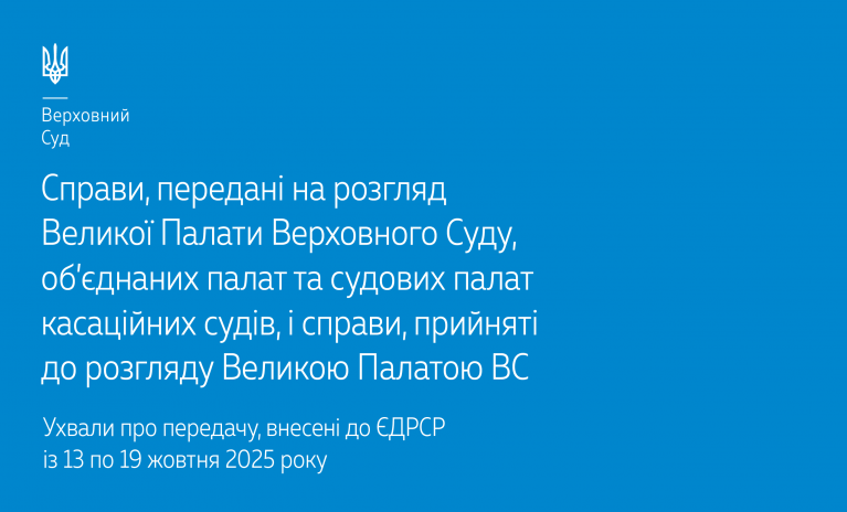 Цього тижня знайомимо вас зі справами, переданими на розгляд Великої Палати Верховного Суду, об’єднаних палат і судових палат касаційних судів, а також зі справами, прийнятими до розгляду Великою Палатою ВС відповідно до ухвал про передачу, внесених до ЄДРСР із 13 по 19 жовтня 2025 року.